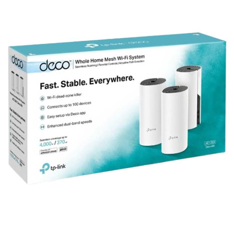 - A Deco M4 three-pack delivers Wi-Fi to an area of up to 4,000 square feet (EU version)†. And if that’s not enough, simply add more Decos to the network anytime to increase coverage.