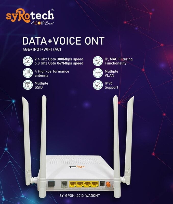 SYROTECH XPON ONT VOICE +WIFI 4 ANTENNA DUAL BAND 4 ETHERNET PORT GIGA SY-GPON-4010-WADONT