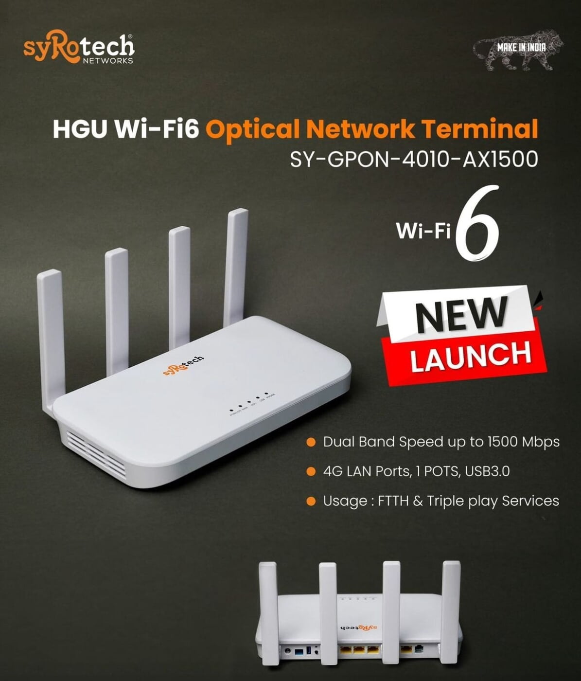 SYROTECH XPON ONT VOICE +WIFI 4 ANTENNA DUAL BAND WIFI 6 SY-GPON-4010-AX1500 1VOICE + 4 GIGA LAN PORTS